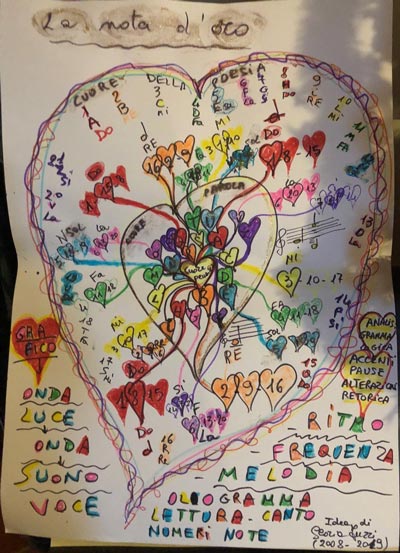 Quindi le lettere, come le note musicali, volano nella loro forma aerea, sonora, luminosa, e ci spiegano con la loro forma i fenomeni naturali che identificano la loro posizione, la loro utilità, la loro forma, il loro fenomeno. L’architettura della parola di una frase, dove ogni parte grammaticale assume una sua posizione, ogni lettera un colore o luce, un suono, una forma, così di seguito con l’analisi logica, dove nella frase, ogni complemento assume una sua collocazione spaziale logica, nella struttura della frase, assumendo per forza, una forma logica, sua propria per definizione , ma assumendo un colore o suono diverso a seconda della persona, che è unica, e ha una diversa conformazione, un suo DNA, una voce personale, come le impronte digitali, quindi un diverso modo di vivere le emozioni, legate al suo cuore, alla sua personalità, unica per ogni soggetto.